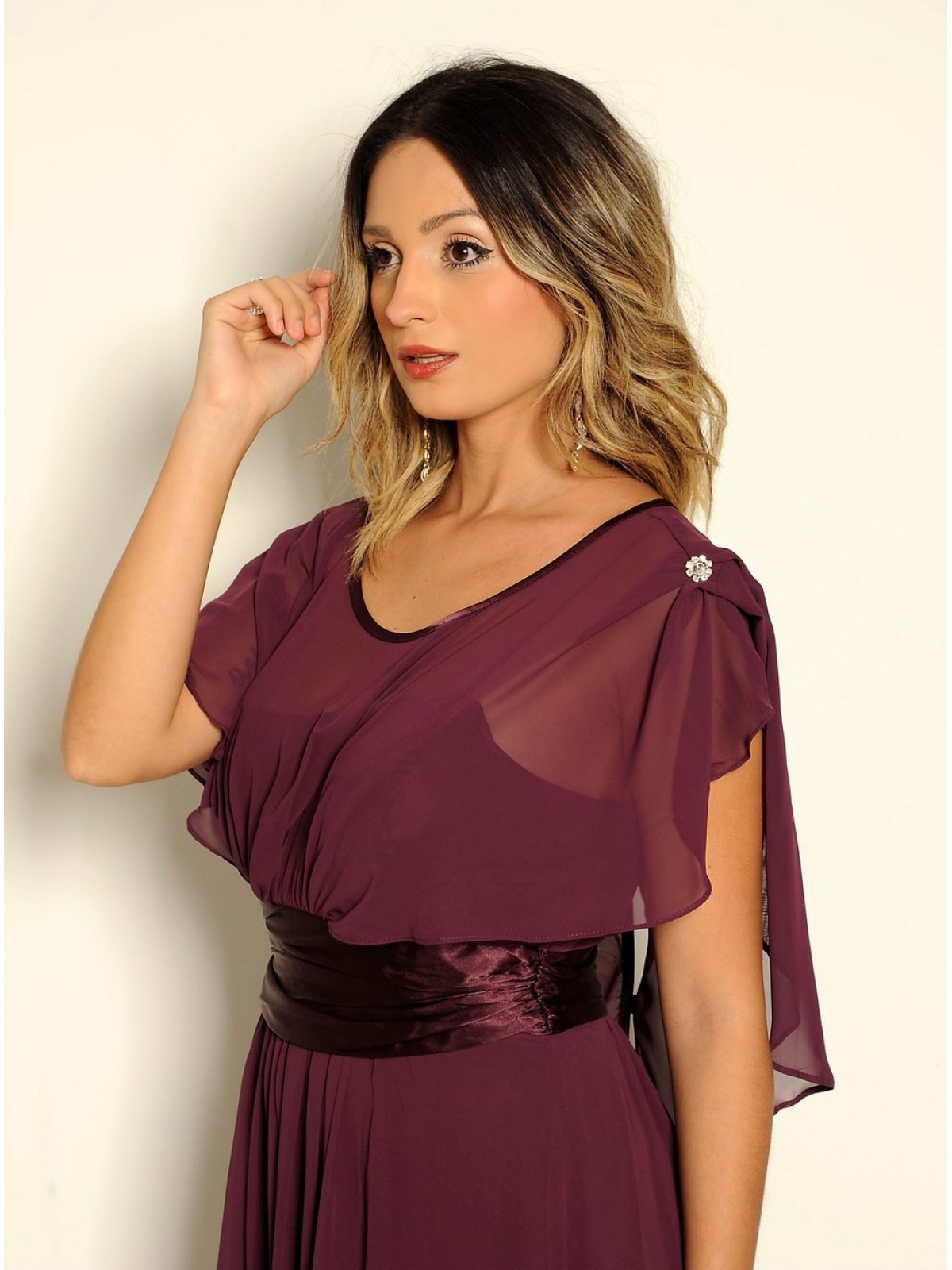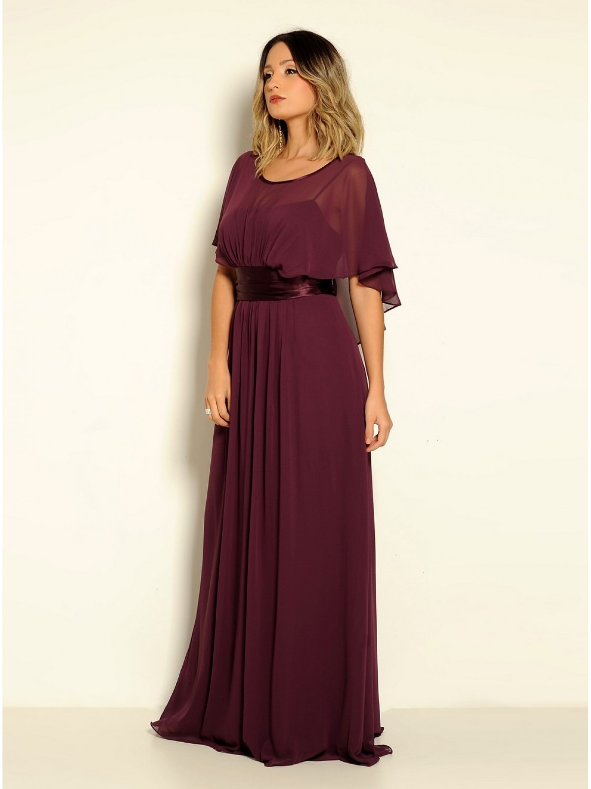 Vestido longo modelo esvoaçante com capa, faixa cetim e saia franzida. Possui forro interno