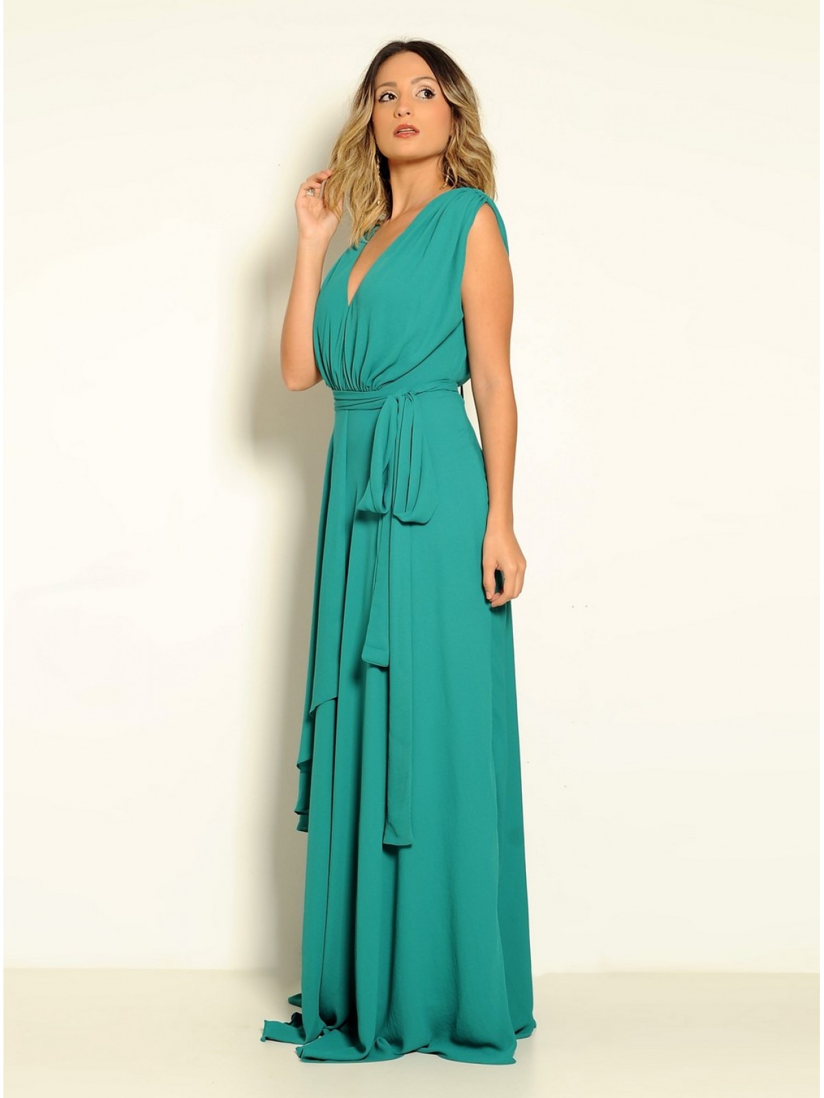 Vestido longo modelo esvoaçante, decote frente e costas "V" faixa na cintura, drapeado no ombro, com detalhe sobre saia