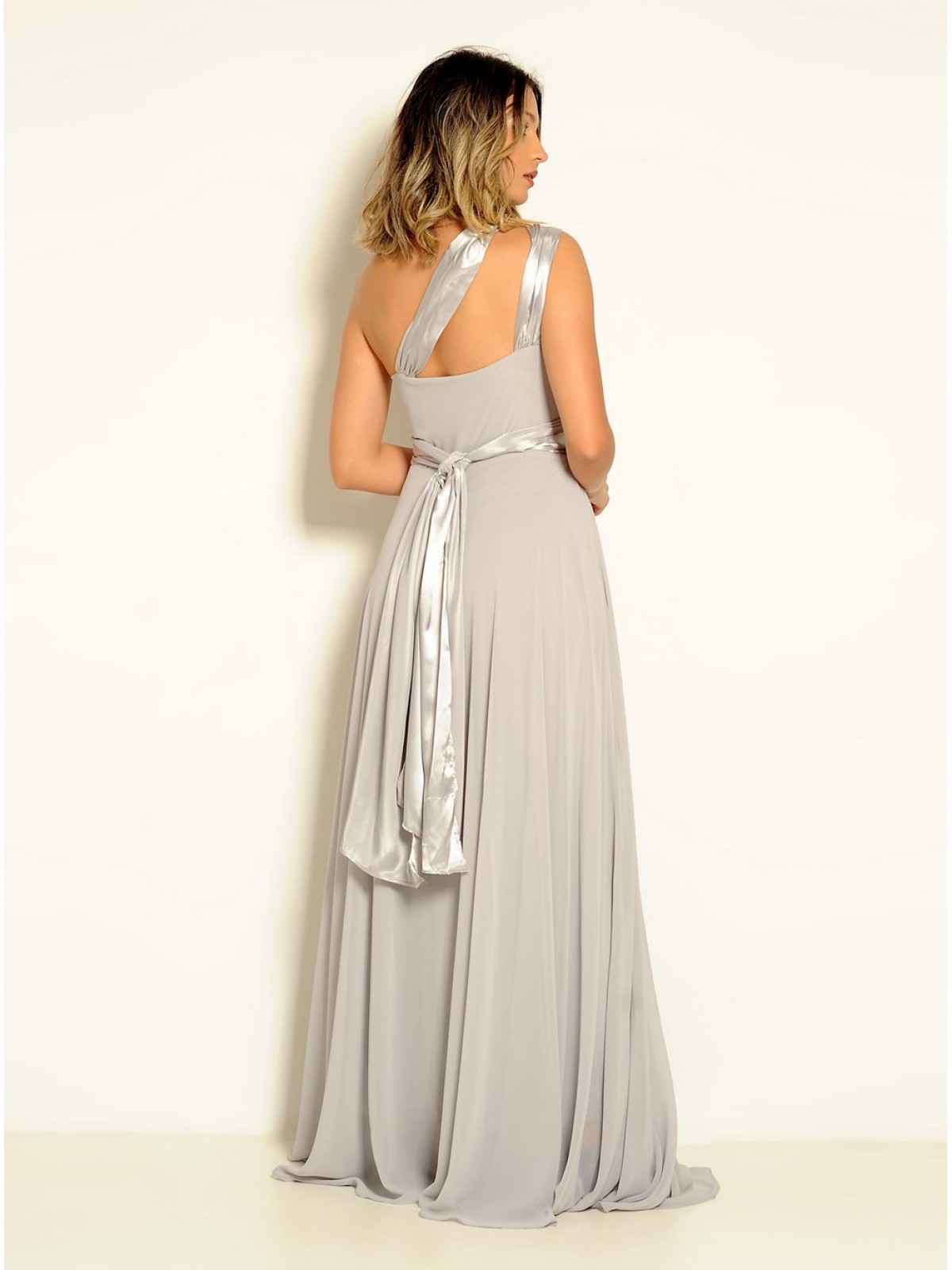 Vestido longo modelo fluido, com duas variações: duas alcas ou um ombro só, possui detalhes de cetim na alca e faixa de cintura. Possui forro interno