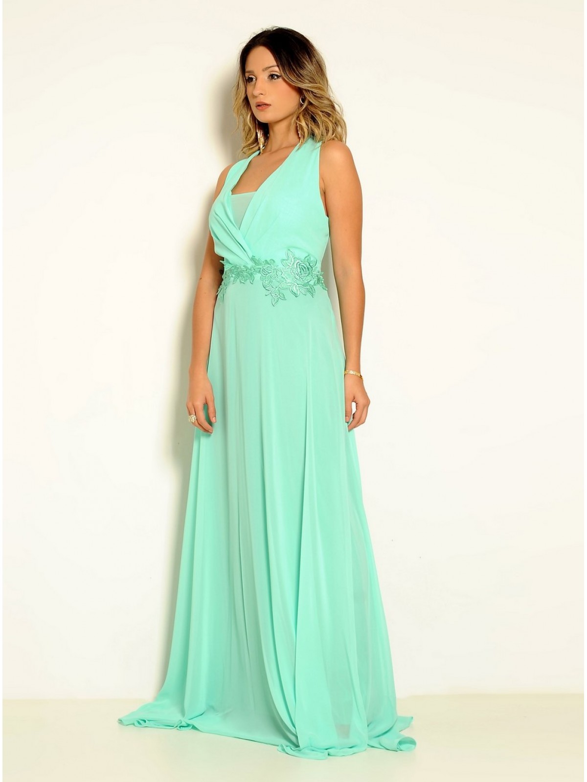 Vestido longo fluido com renda gripper na cintura. Possui forro interno e bojo