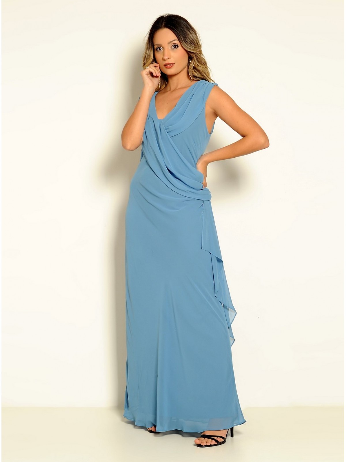 Vestido longo detalhe drapeado, decote frente e costas, calda lateral e saia reta. Possui forro interno corte em viés