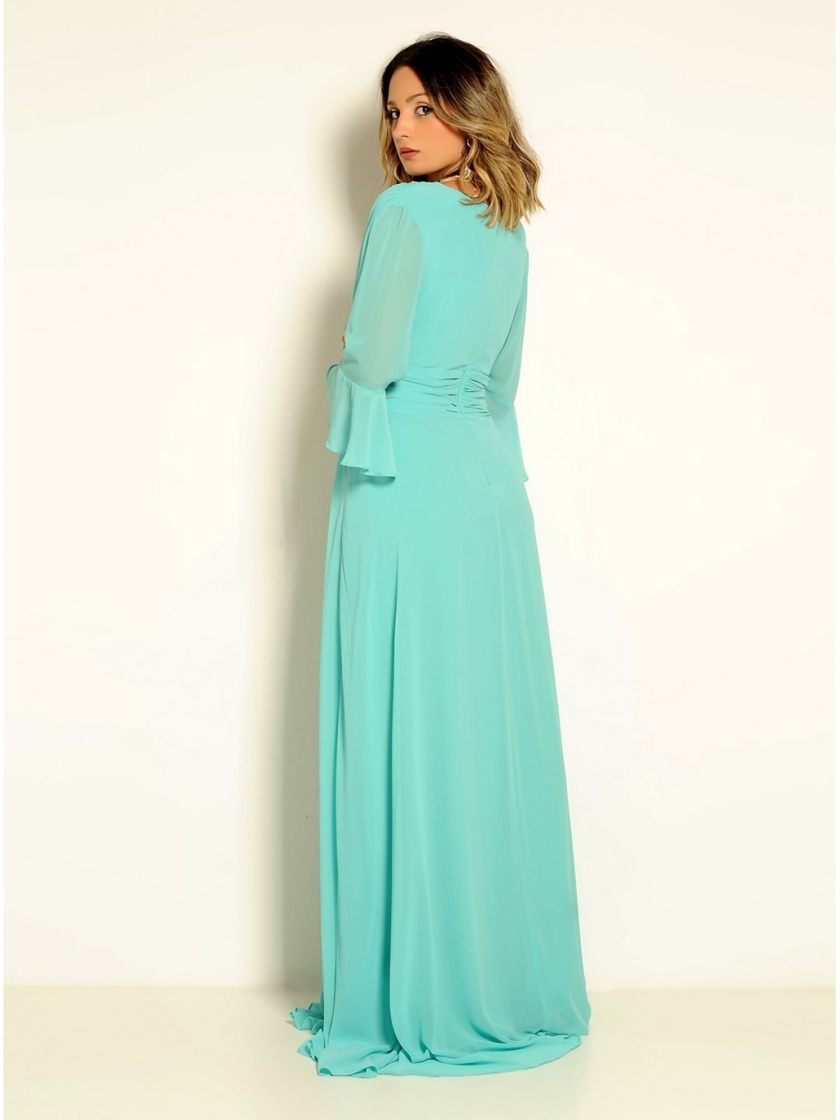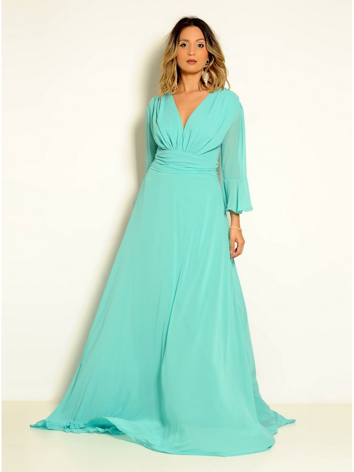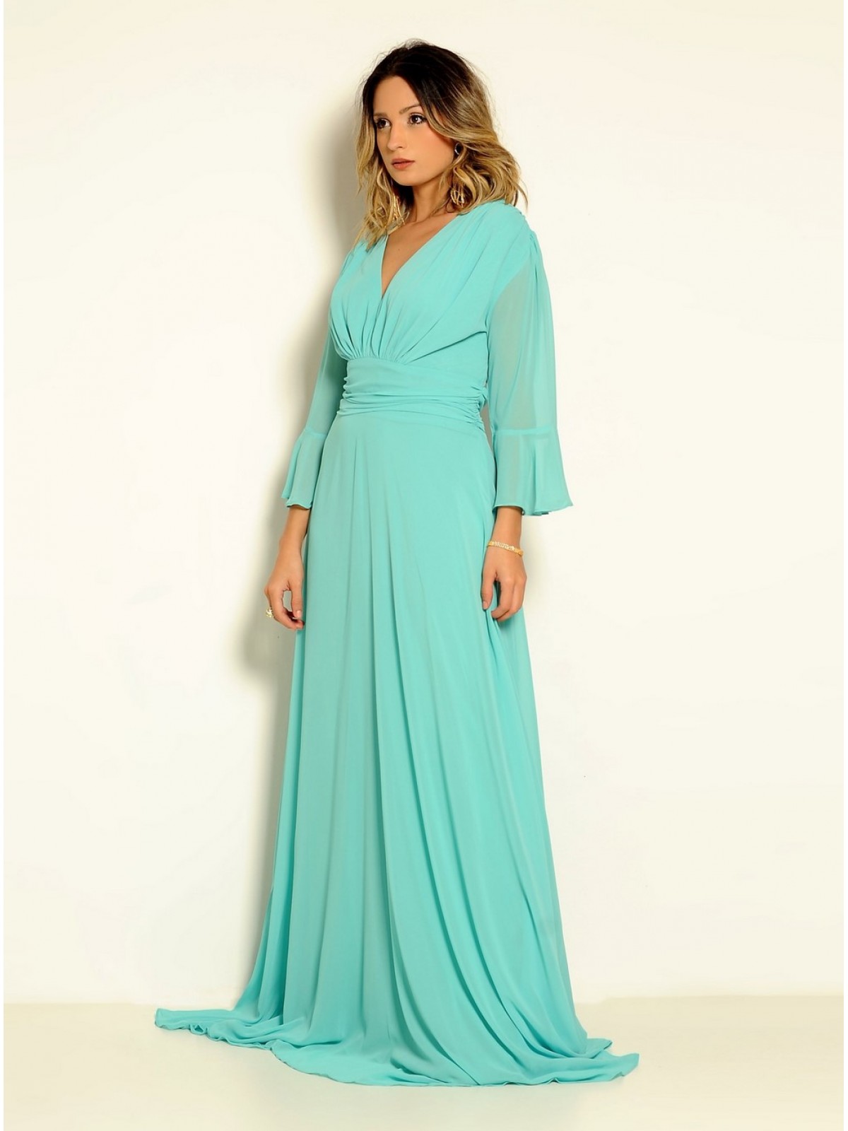 Vestido longo fluido,cintura com drapeado, manga 3/4 com acabamento babado, franzido no decote e ombro. Possui forro interno.