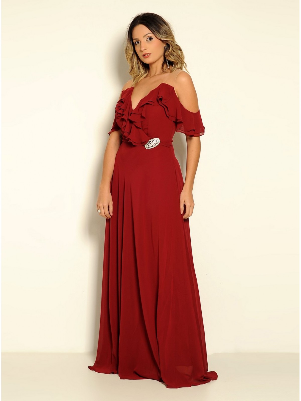 Vestido longo modelo esvoaçante, babado no decote e manga, tule nas costas, faixa na cintura e saia em viez. Forro interno e bojo.